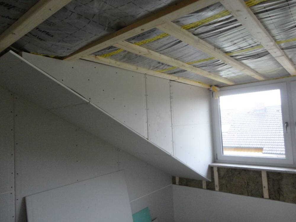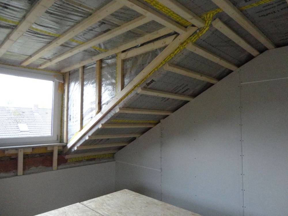 Vor der Montage der Rigipsplatten und zum Zwecke der Isolierung verlege ich zwischen den Sparren zunächst Steinwolle. Diese sind in Rollen erhältlich und werden nach der Verlegung winddicht abgeklebt. Danach erfolgt die Montage einer Lattung, bei Bedarf auch zusätzlich noch die Montage einer Konterlattung.